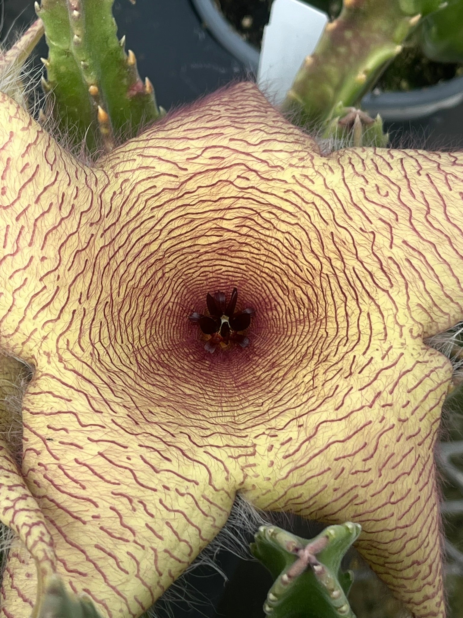 Let’s talk bloom day. The star is huge, fuzzy, and striped—like a desert sea creature. The scent is how Stapelia calls in its pollinators (flies). It is strongest up close and often fades after a day or two. Place the plant where you can admire the flower and still give it a bit of air flow. A nearby open window or a porch visit during peak fragrance works great.