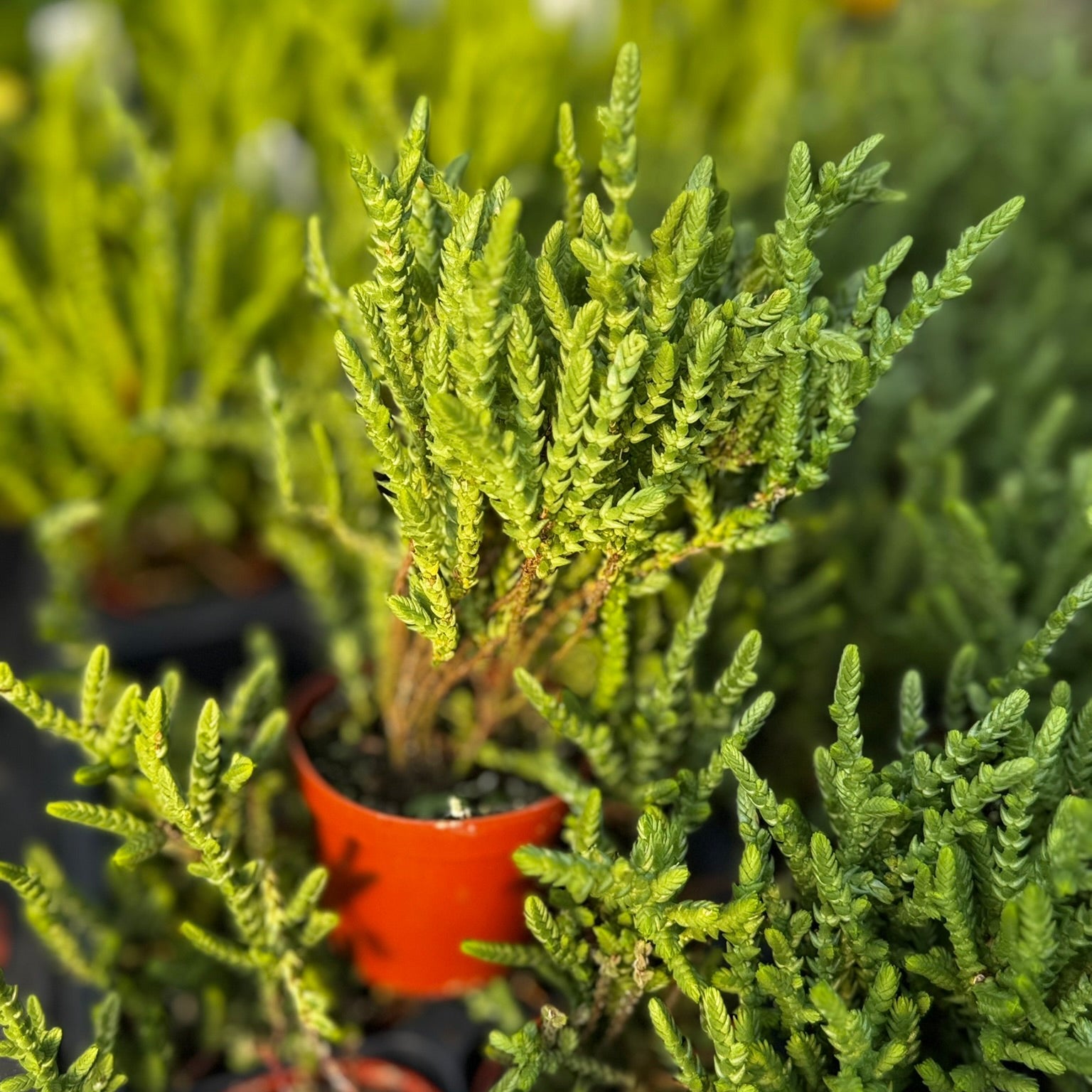 Crassula muscosa, commonly referred to as Princess Pine or Watch Chain Plant, is a compact, trailing succulent prized for its delicate, interlocking, and tightly packed leaves that resemble tiny pine needles or chain links. Native to South Africa and Namibia, this low-maintenance plant is perfect for hanging baskets, dish gardens, or as ground cover in warm climates. Its charming texture and form make it a favorite for succulent enthusiasts.